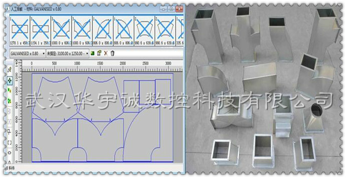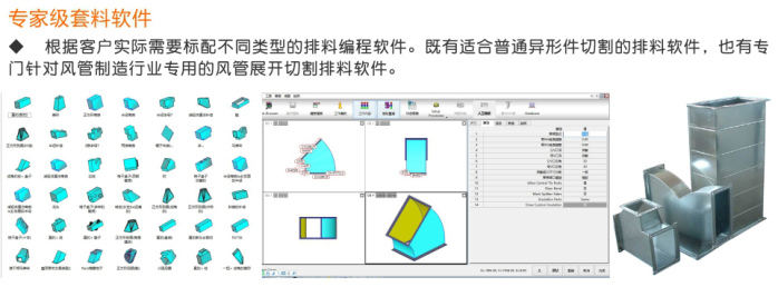 武漢華宇誠(chéng)數(shù)控生產(chǎn)的通風(fēng)管道數(shù)控等離子切割機(jī),針對(duì)風(fēng)管展開切割進(jìn)行了專門優(yōu)化。切割速度更快、切割精度更高、切割效果更好。并搭配專門的風(fēng)管展開軟件,用戶只需選擇要切割的風(fēng)管類型,輸入相應(yīng)尺寸參數(shù),便可自動(dòng)排料、自動(dòng)生成加工程序,用戶直接用U盤在切割機(jī)上調(diào)入加工程序切割即可。